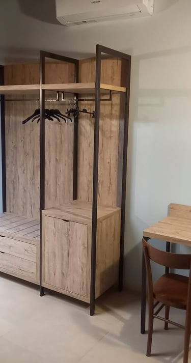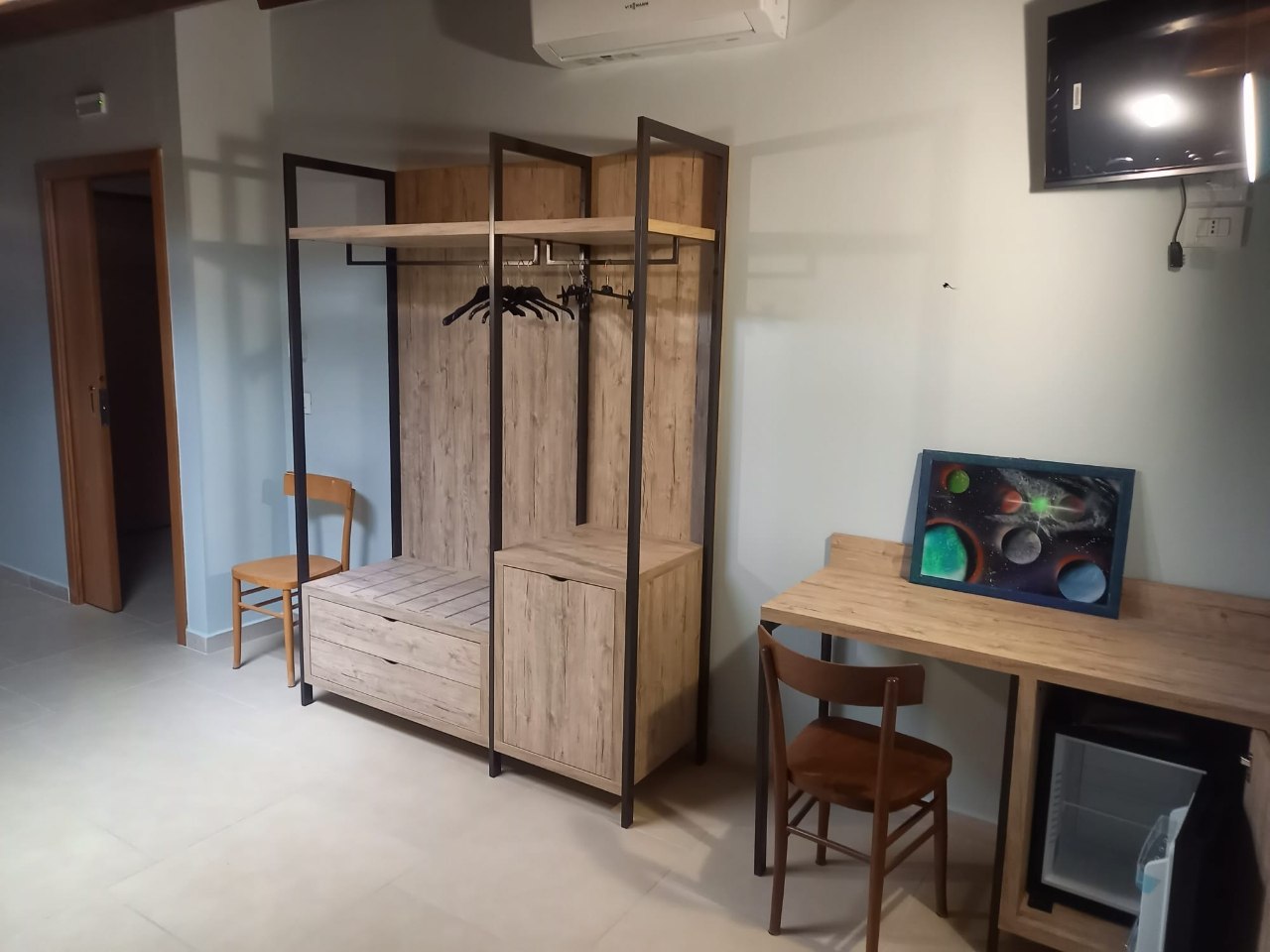 Nasce nella parte esposta ad Ovest Si viene accolti dal blu notte delle pareti che si fonde con le tonalità marroni e grigie del legno.