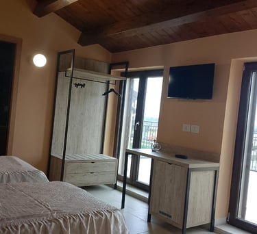 La camera è dotata all’esterno di un terrazzino indipendente con tavolo e sedie, perfetto per la colazione/degustazioni serali all’aria apertaluminosa e romantica , gode di un ampio terrazzo indipendente e panoramico che si affaccia a Nord-Ovest verso il Lago Abate Alonia